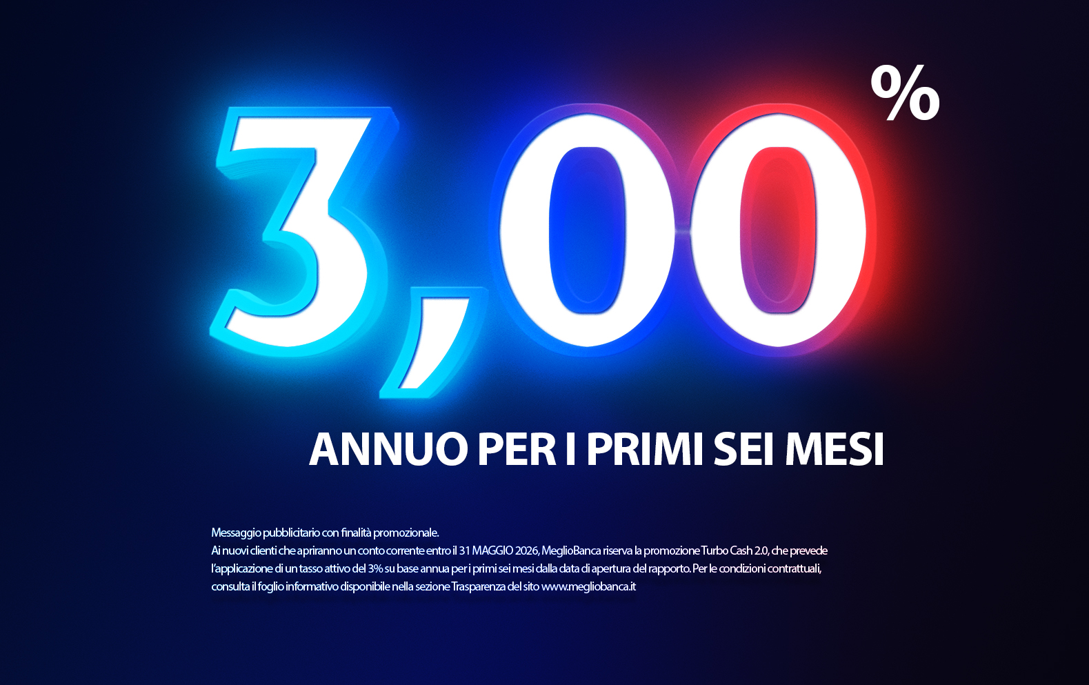 Turbo Cash 2.0 è l’iniziativa pensata per i nuovi clienti MeglioBanca che vogliono dare più valore alla propria liquidità fin da subito.